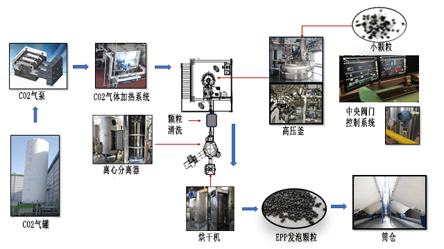 Epp材料生產(chǎn)所使用到的設(shè)備包括二氧化碳?xì)獗煤蜌夤?、氣體加熱系統(tǒng)、高壓釜、離心分離器、中央控制系統(tǒng)、烘干機(jī)、筒倉(cāng)等。大致的作用可看上圖。